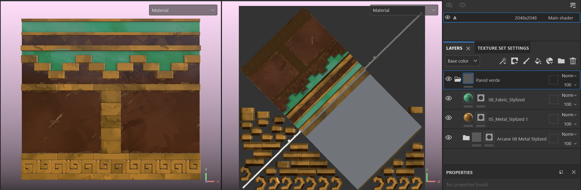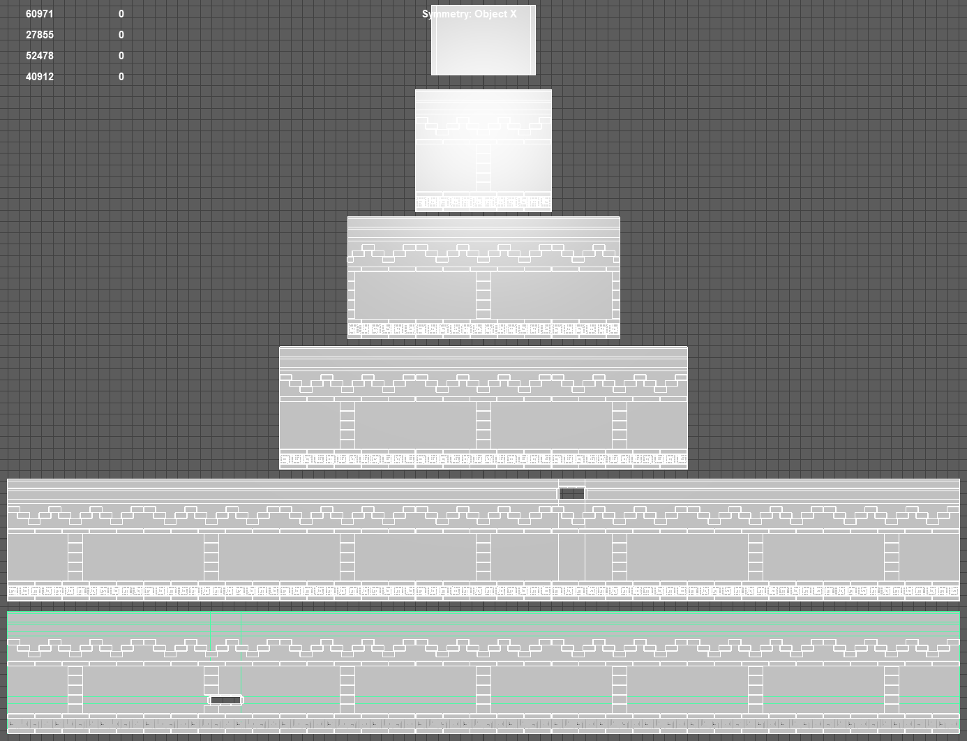 The process was more or less the same as before: I first made a base wall with all the decoration, and from there I generated several longer or shorter versions to fit well into the levels. Then I transferred everything to Substance and put together a material that would help me maintain consistency in the textures.